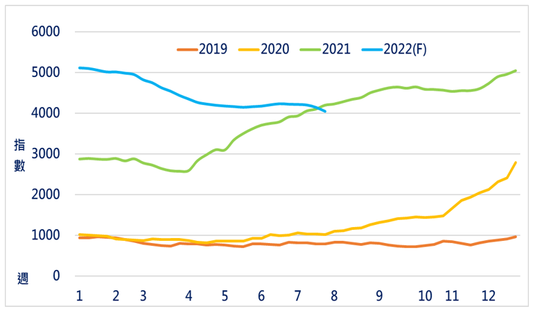 觀察SCFI過去季節性波動,每年運價於7、8月進入小旺季,9月、10達到運價與運量的最高峰,並於10月中下旬進入旺季尾聲(圖2)。隔年2月為春節小旺季,隨後貨櫃海運市場進入淡季。觀察2022年SCFI的表現,運價在進入7月份後呈現旺季不旺的走勢,顯現全球需求在高通膨的壓力,以及去庫存的壓力之下,呈現疲態。