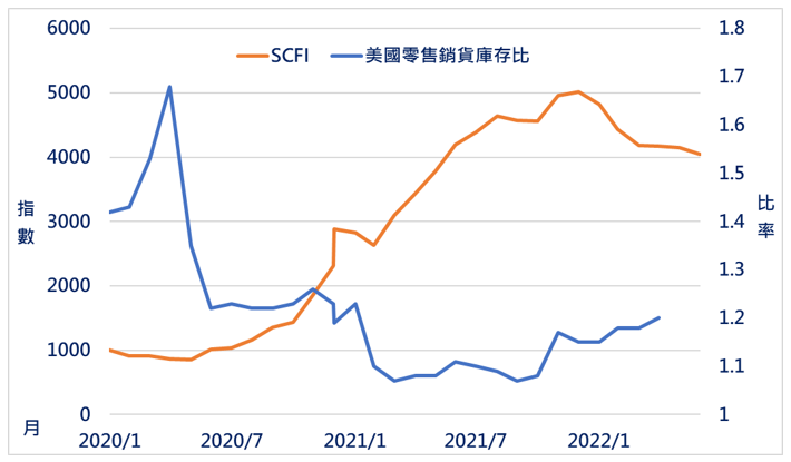 由於零售商運輸主要透過貨櫃海運系統,故庫存水位的高低間接影響美國市場貨運拉貨需求。觀察發現銷貨庫存比與SCFI兩者呈反向變動,並具2個月左右的領先性,可視為海運市場運價的領先指標。6月份零售銷貨庫存比回升至1.2,高於去年同期的1.08%,並在2021年上半年持續回溫,反映在貨櫃海運進入年後淡季的期間,美國零售商的庫存持續回補,遞延的貨櫃船業持續地將貨送抵美東、美西。